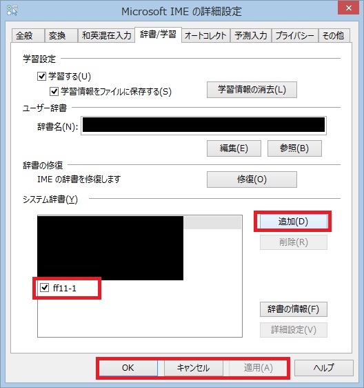 辞書/学習タブ、追加>自分の作ったシステム辞書を指定>適用>ok