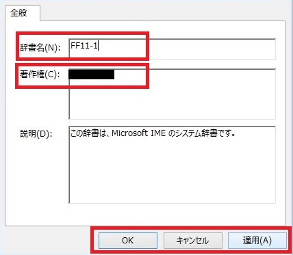例:辞書名は今回FF11-1とし、著作権は適当なのを入れてみました。